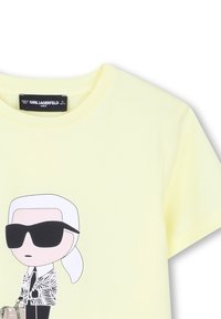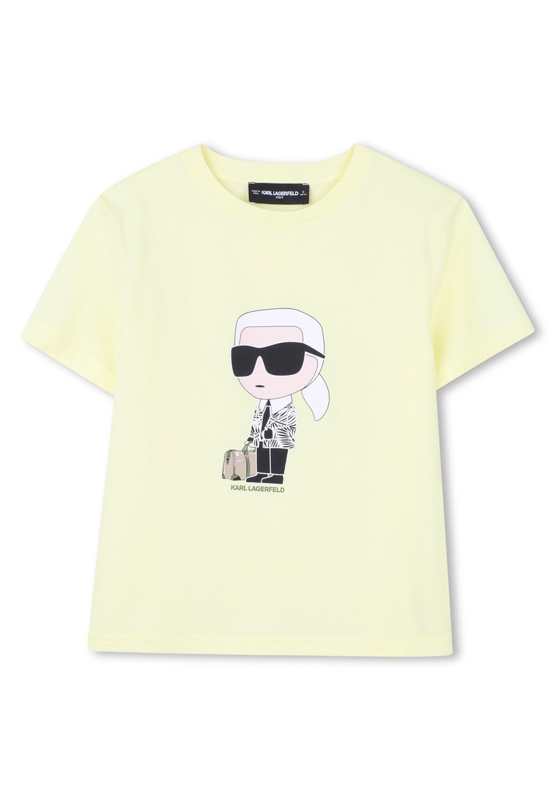 T-shirt en coton jaune avec un personnage de dessin animé aux cheveux blancs, portant des lunettes de soleil, une veste à motifs, et un petit sac, portant l'inscription "KARL LAGERFELD".