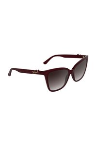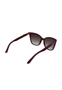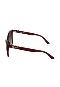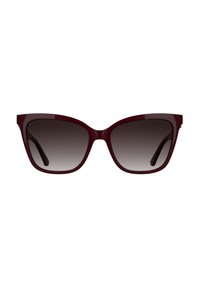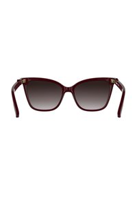 Lunettes de soleil en plastique marron foncé avec une forme œil-de-chat, verres dégradés foncés et un logo doré en accent sur la branche. Texture lisse et design audacieux.