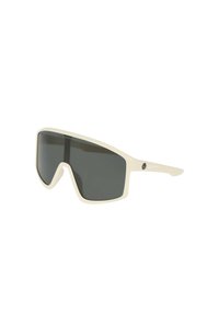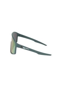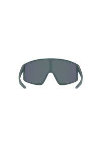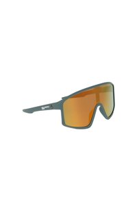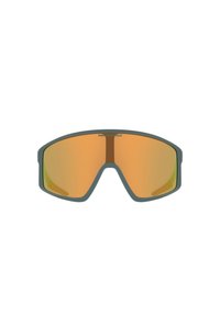 Lunettes de soleil sportives enveloppantes avec monture grise et verres orange miroitants, arborant le logo Karl Lagerfeld Jeans sur la branche.