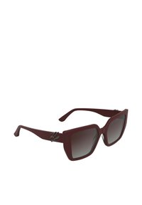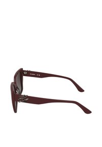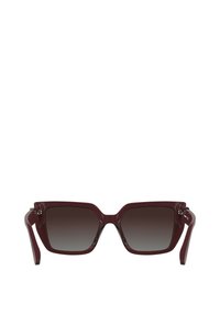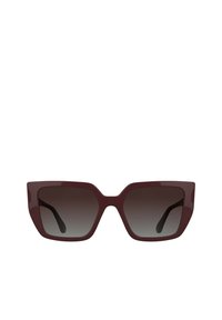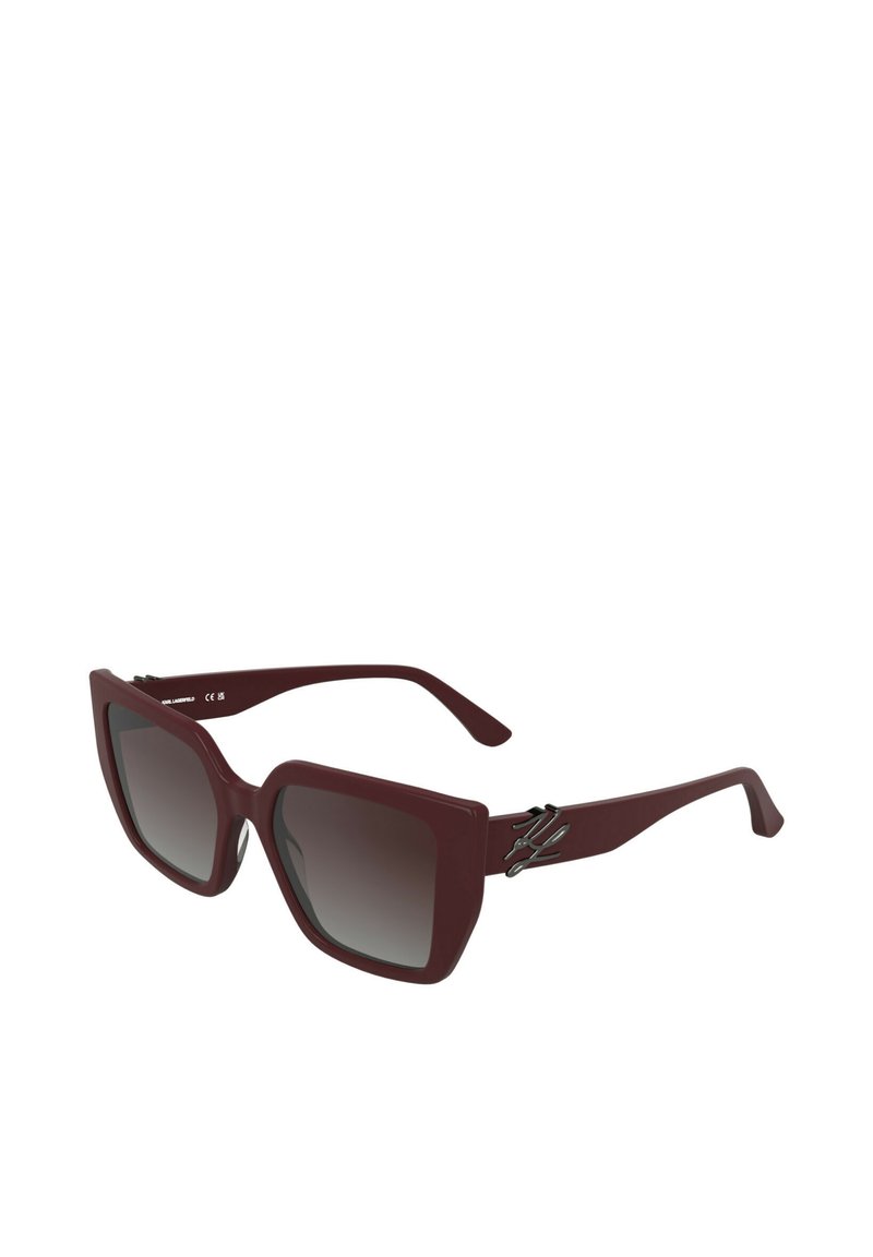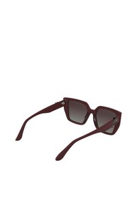 Lunettes de soleil oversize bordeaux avec verres dégradés, monture carrée audacieuse et accent métallique sur les branches.