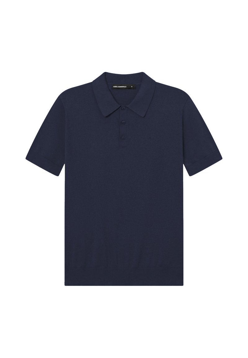 Polo manches courtes bleu marine avec col et patte de boutonnage à trois boutons, avec une broderie de logo discrète sur la poitrine.