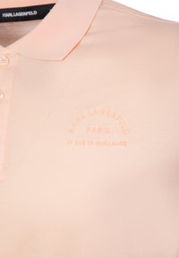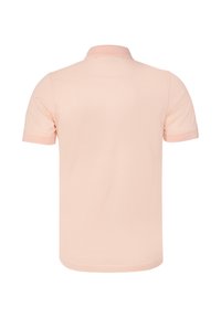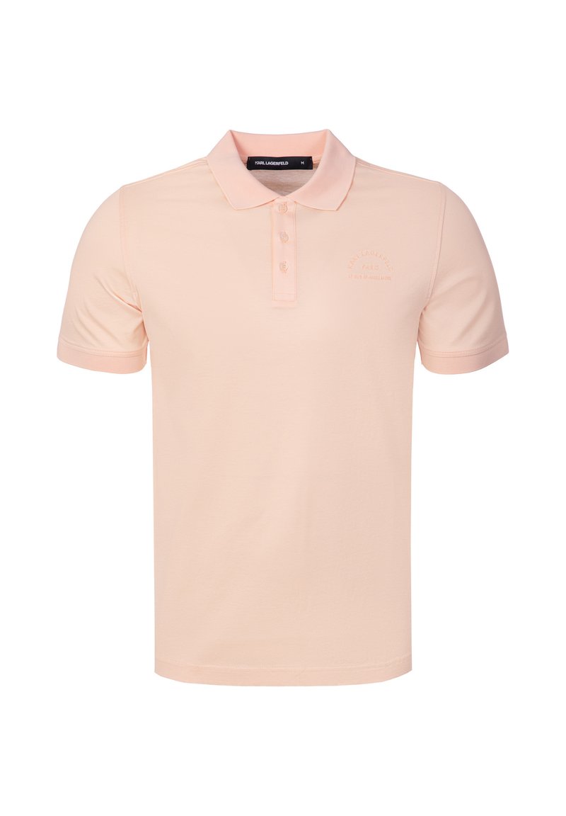 Polo rose clair à manches courtes avec col et trois boutons, avec un texte brodé discret sur la poitrine gauche.