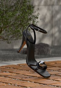 Sandale blanche à talon haut avec bride à la cheville et grande perle décorative sur la bride avant, présentée sur un fond clair uni.