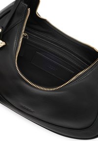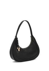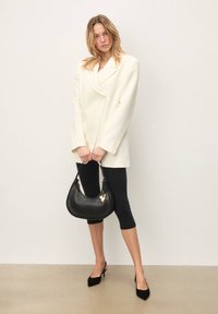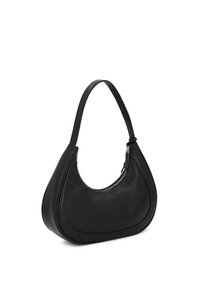 Sac à main en cuir noir à la forme courbée avec un accent doré, porté à l'épaule sur un blazer blanc, sur un fond neutre.