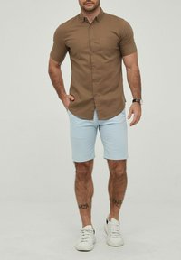 Chemise marron à manches courtes avec un col, dotée d'une poche poitrine et d'une texture douce, associée à un pantalon bleu clair.
