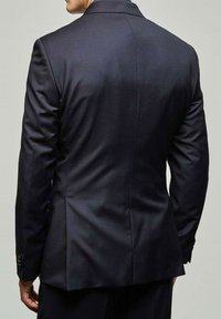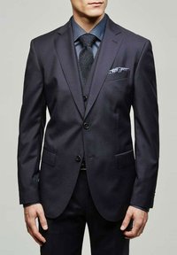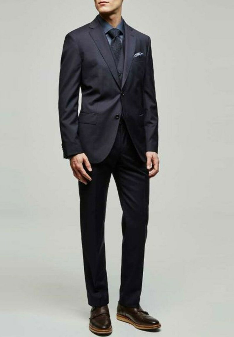 Costume bleu marine foncé avec un revers cranté et une fermeture à deux boutons. Associé à une cravate et un mouchoir de poche assortis. Des chaussures habillées marron complètent le look.