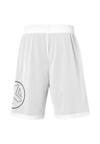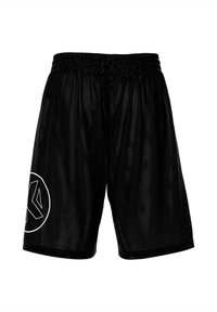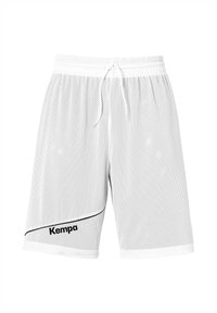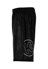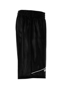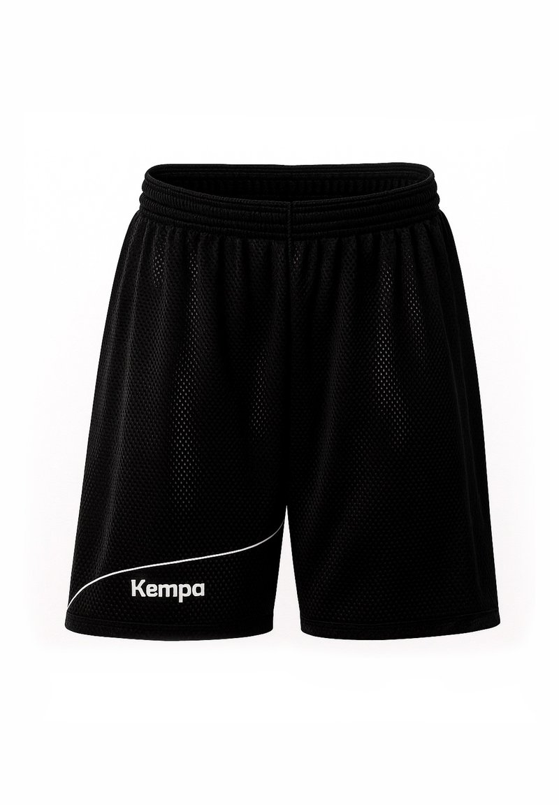 Shorts de sport en mesh noir avec ceinture élastique, logo Kempa blanc et ligne courbée près de l'ourlet gauche.