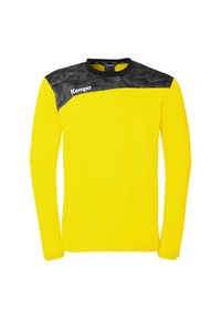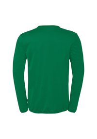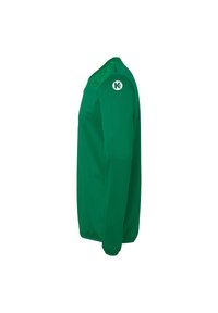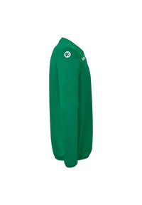 T-shirt de sport à manches longues vert avec un motif géométrique sur les épaules et le logo "Kempa" sur la partie supérieure de la poitrine.