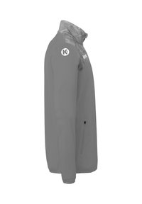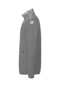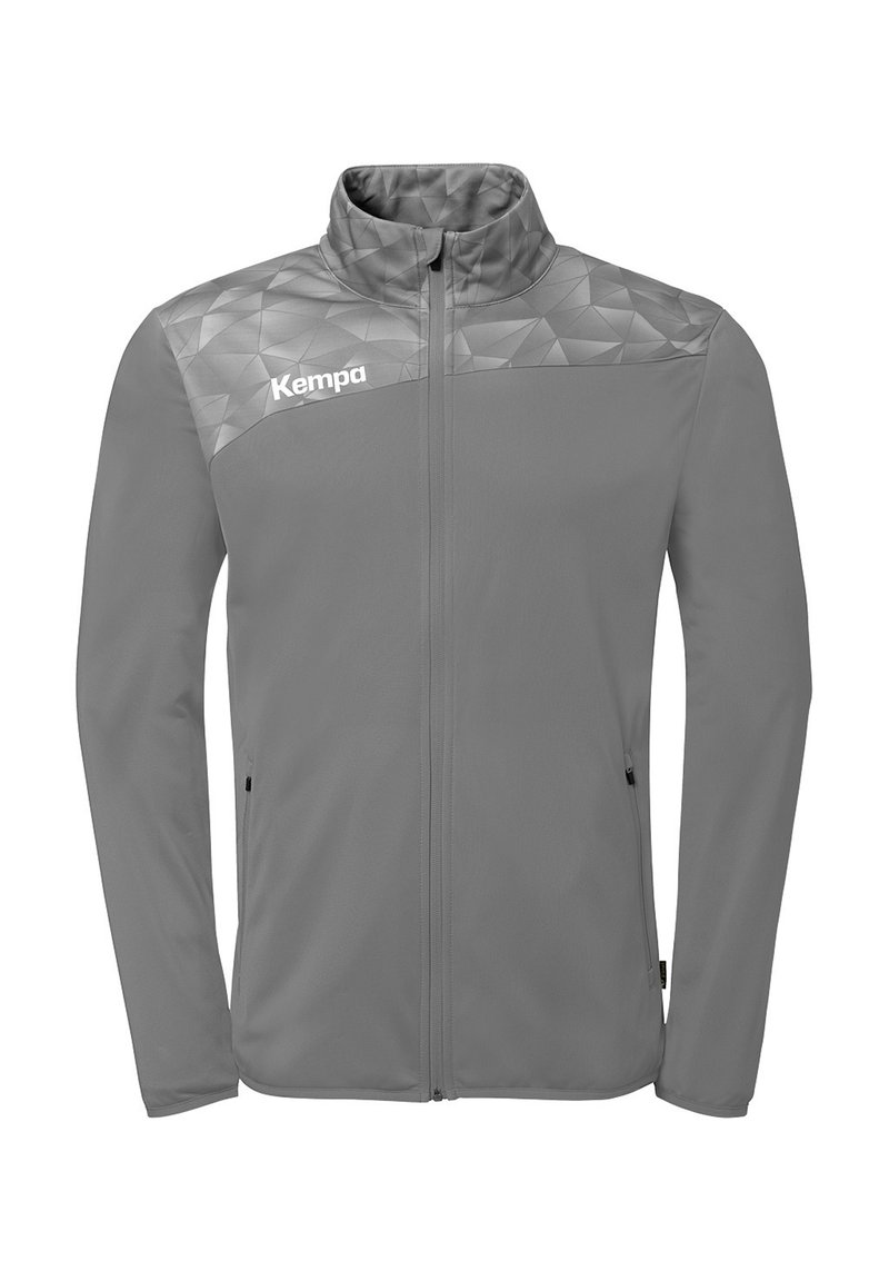 Veste de sport grise zippée avec motif géométrique sur les épaules et logo "Kempa" sur la poitrine gauche, comprenant deux poches latérales zippées.