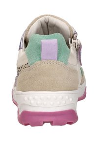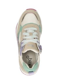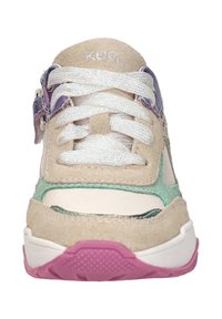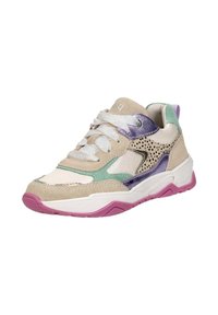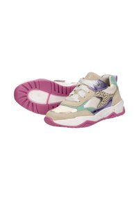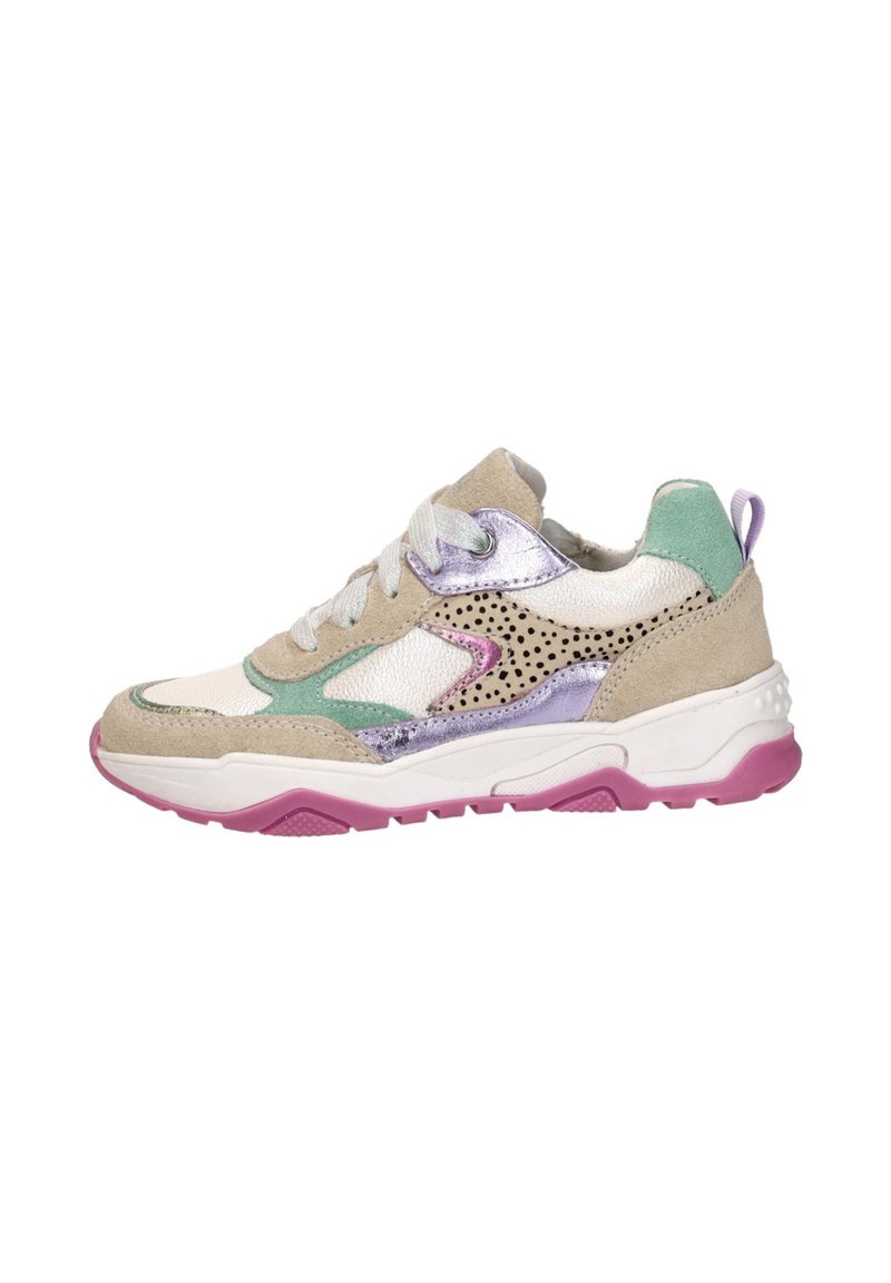 Baskets épaisses en daim beige, cuir blanc, accents vert menthe et violet métallique, motif tacheté sur le côté, et semelle en caoutchouc rose.