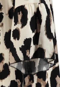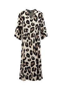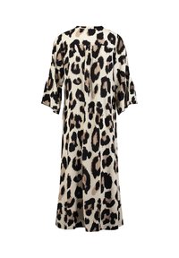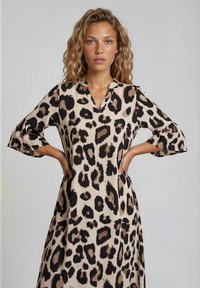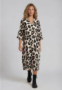 Femme aux cheveux ondulés portant une robe imprimée léopard beige et noire longueur genou et des bottines noires à lacets sur un fond uni.