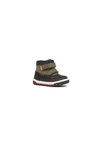 Botte d'hiver pour tout-petit noire et vert olive avec deux sangles ajustables, semelle blanche et orange avec bordure, et semelle extérieure en caoutchouc texturé.