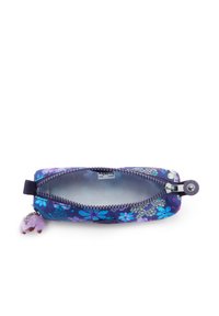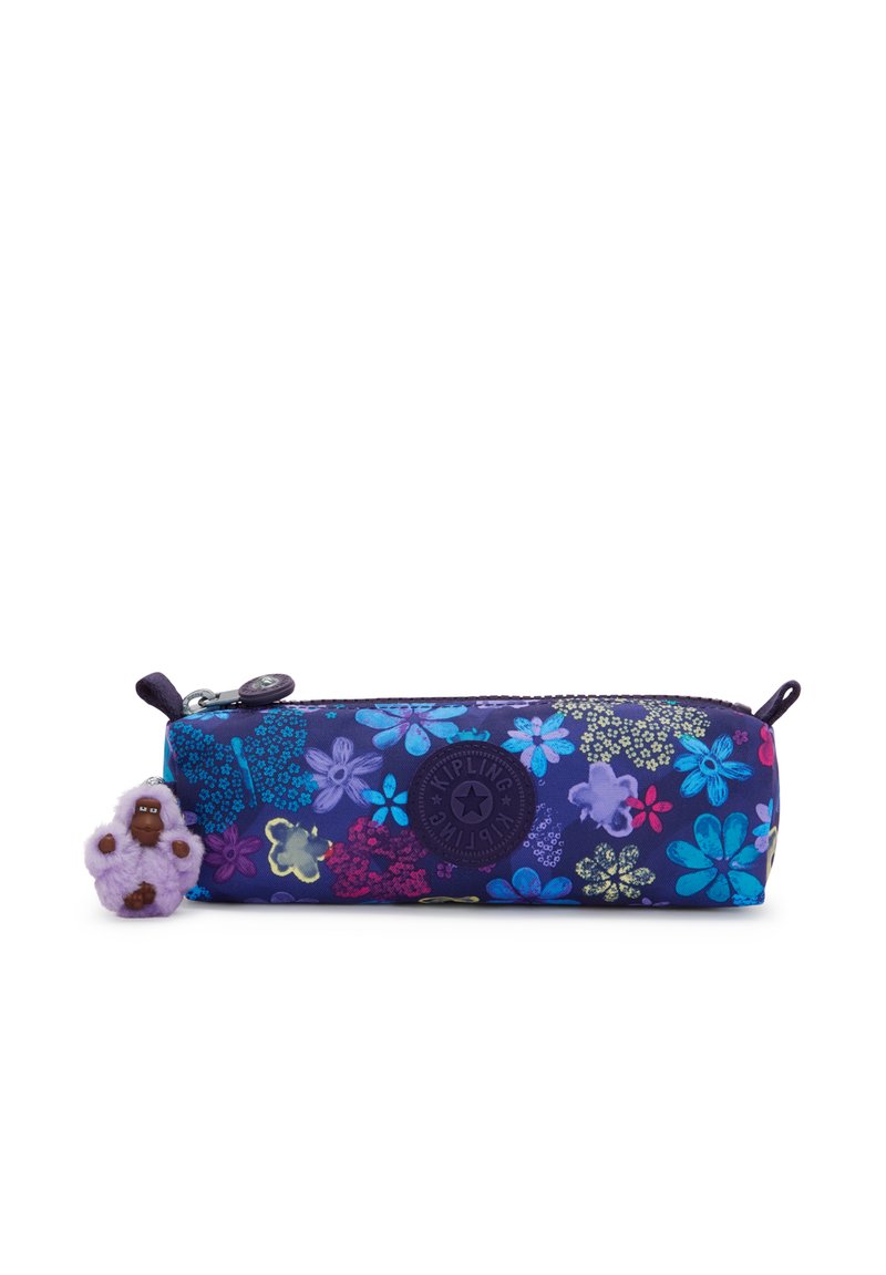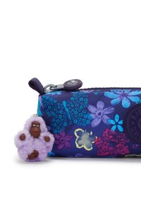 Trousse rectangulaire bleu marine avec motifs floraux multicolores, logo rond Kipling, fermeture éclair sur le dessus et un petit porte-clés singe violet attaché.