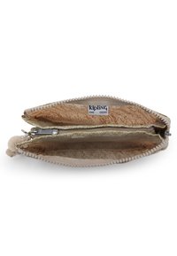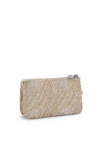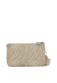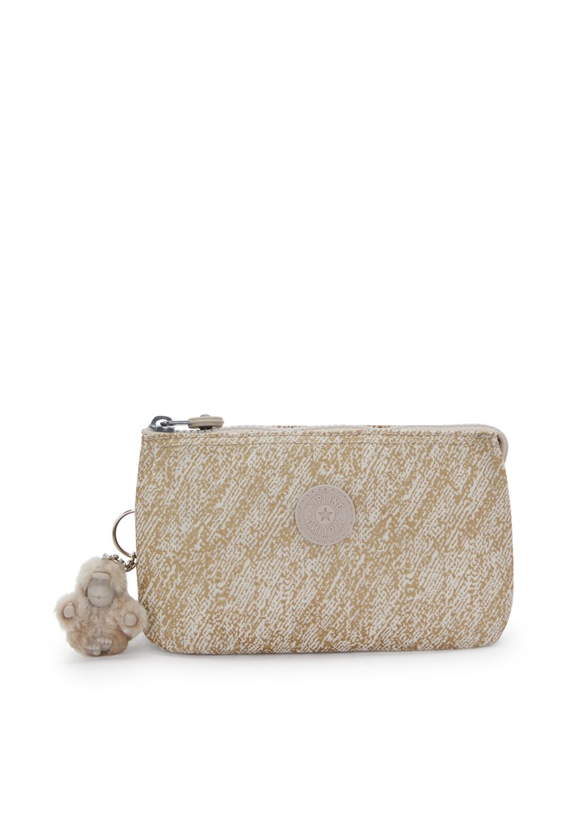 Pochette beige à motifs avec fermeture éclair, en matériau texturé, ornée d'un logo et d'un porte-clés en fourrure attaché.