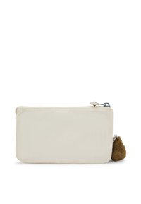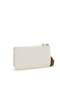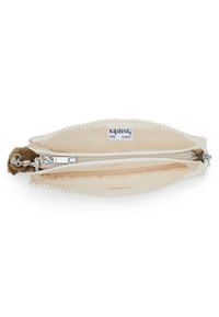 Pochette rectangulaire beige avec fermeture éclair, logo rond Kipling et petit porte-clés singe en peluche marron attaché à la tirette.