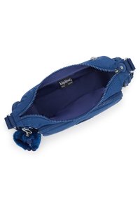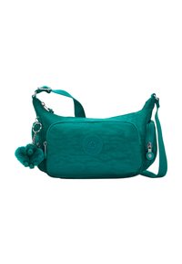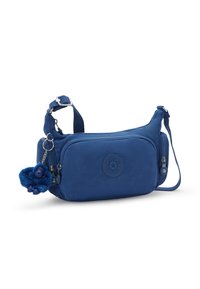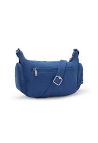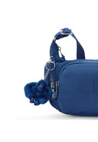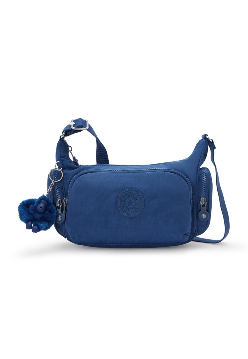 Sac à bandoulière en nylon bleu de forme arrondie, avec une poche zippée à l'avant, un patch logo et un porte-clés singe en peluche. Sangle réglable incluse.