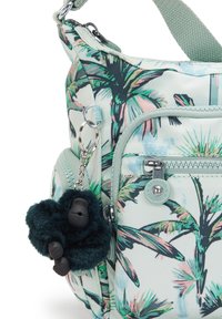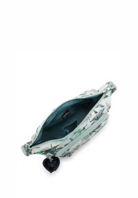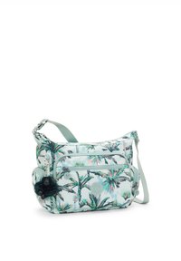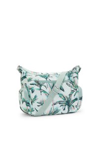 Sac bandoulière avec un imprimé de feuilles de palmier tropical en vert menthe, doté d'un porte-bijoux en peluche, d'une sangle ajustable et de plusieurs compartiments zippés.