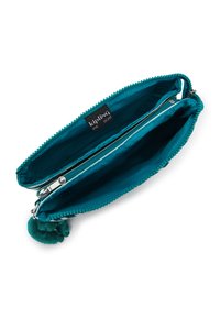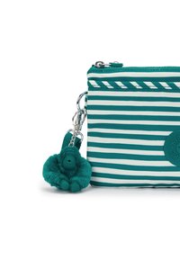Pochette rayée vert sarcelle et blanc en tissu doux, avec fermeture éclair, bandoulière amovible et porte-clés singe en peluche.