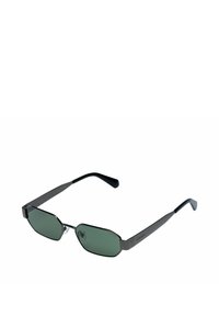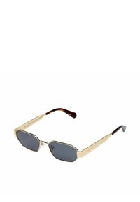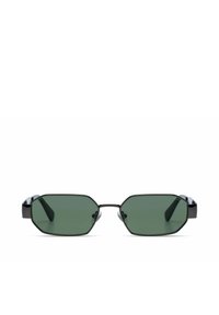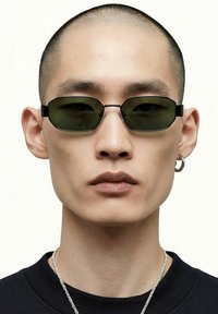 Jeune personne aux longs cheveux bouclés et foncés, portant des lunettes de soleil rectangulaires noires et une veste zippée rouge avec des rayures blanches.