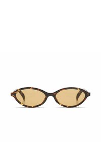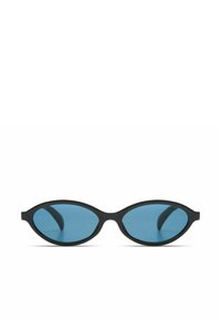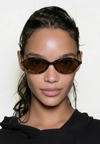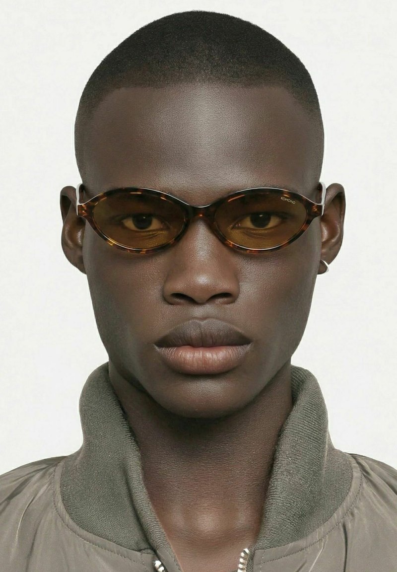 Jeune homme noir aux cheveux très courts portant des lunettes de soleil ovales écaille de tortue et une veste bomber verte, sur un fond blanc uni.