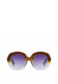 Lunettes de soleil octogonales avec une monture dégradée brun à transparent et des verres teintés de violet inclinées légèrement vers la droite sur fond blanc.