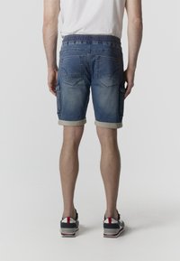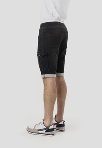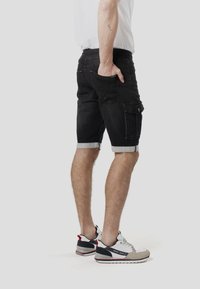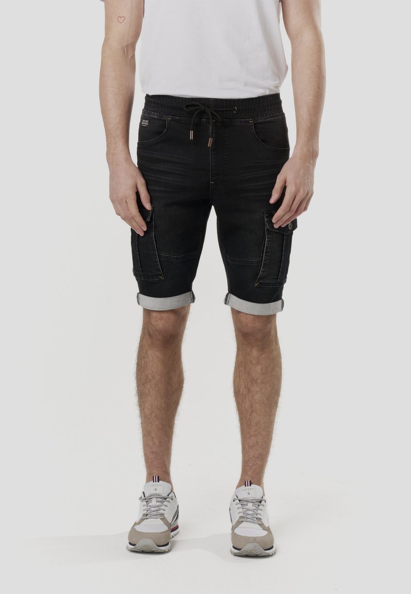 Shorts en jean noir avec revers roulés, dotés de deux grandes poches latérales, d'une taille à cordon de serrage et de détails de surpiqûres contrastantes.
