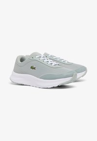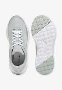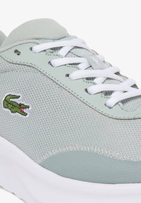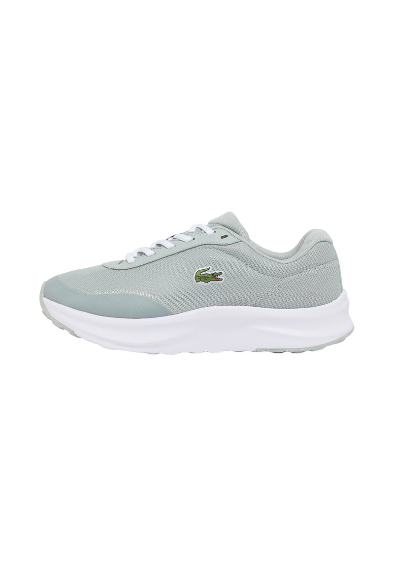 Chaussure de sport gris clair avec semelle et lacets blancs, dessus en tissu mesh et logo crocodile vert sur le côté.