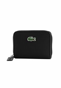 Portefeuille zippé texturé noir avec un logo crocodile vert et une petite languette rectangulaire sur la fermeture éclair.