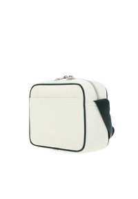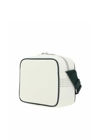 Sac bandoulière rectangulaire blanc avec une bordure noire, une sangle réglable vert foncé et un logo Lacoste embossé à l'avant.