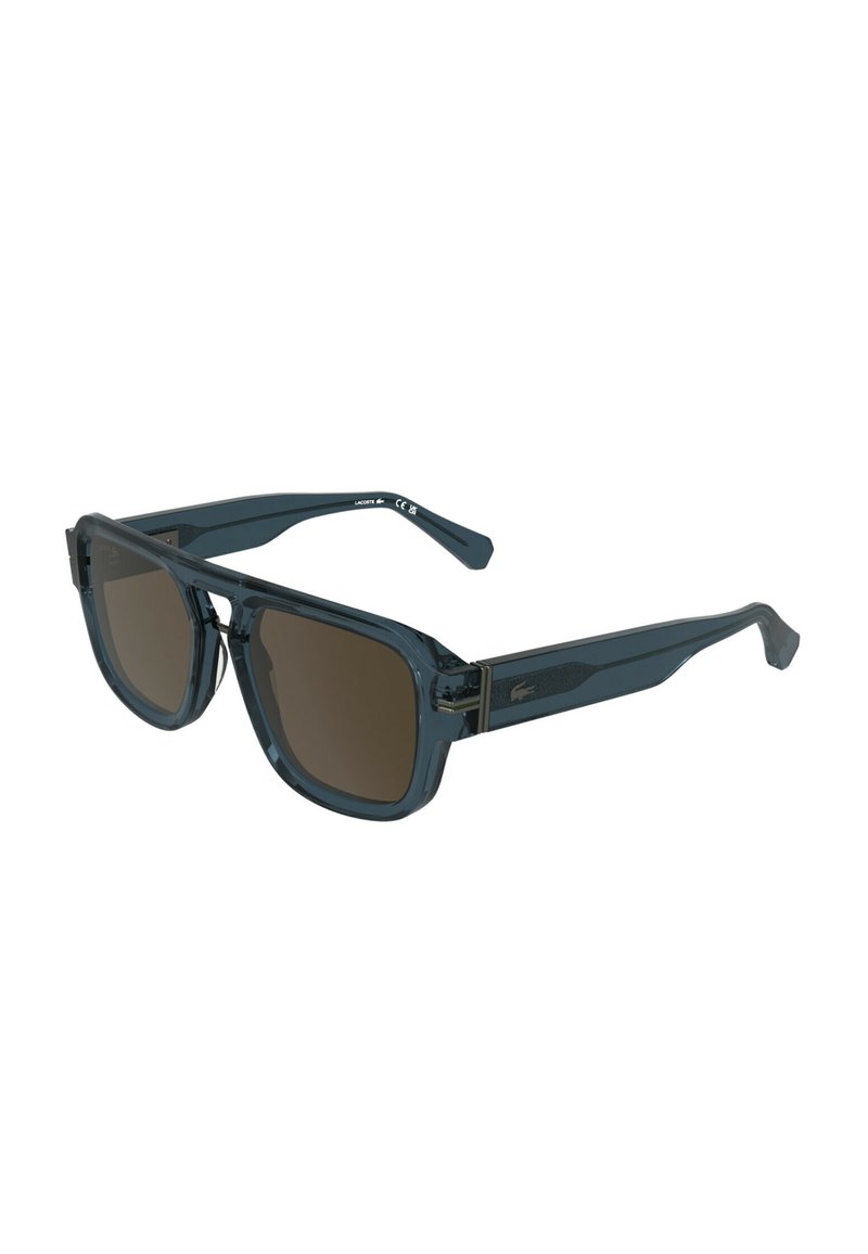 Lunettes de soleil rectangulaires transparentes bleu foncé avec des verres bruns et un petit logo Lacoste sur les branches.