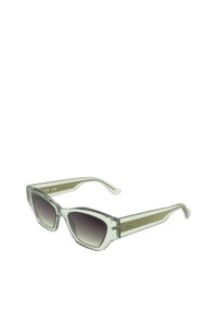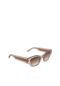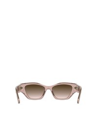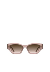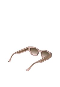 Lunettes de soleil angulaires en plastique translucide rose clair, avec des verres dégradés marron et des accents texturés dorés sur les branches.