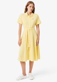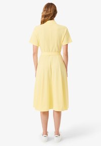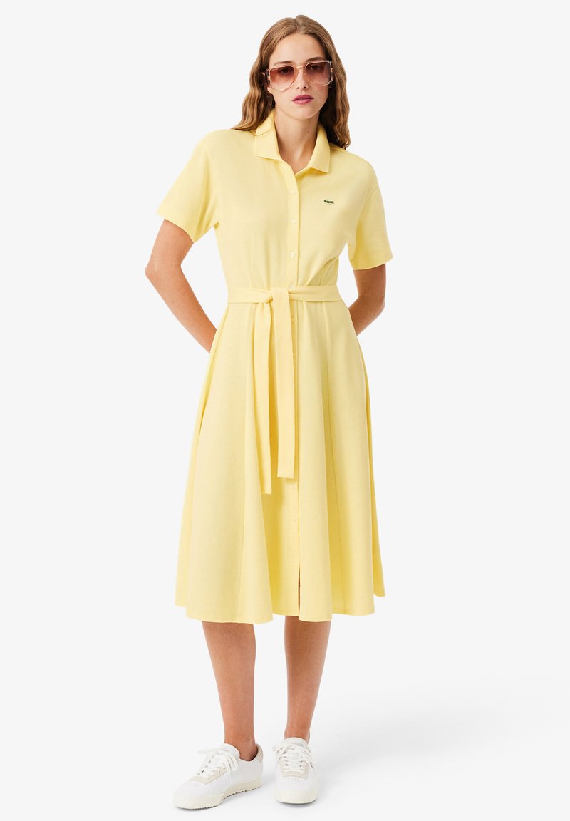 Femme portant une robe midi boutonnée à manches courtes de couleur jaune pâle avec une ceinture à la taille, des baskets blanches et des lunettes de soleil marron, debout avec les mains dans le dos.