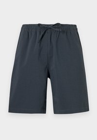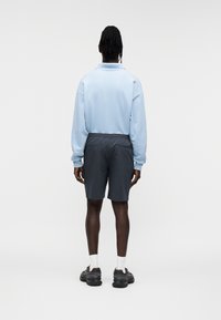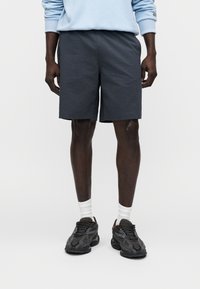Shorts gris texturés à coupe décontractée, longueur mi-cuisse. Associés à des chaussures noires et des chaussettes blanches montantes.