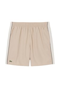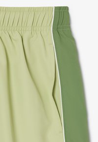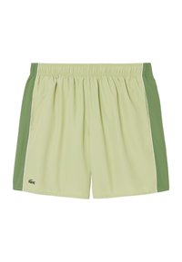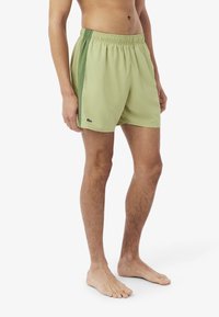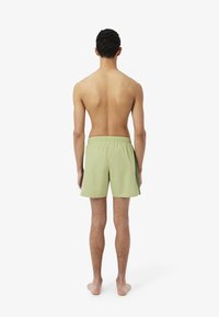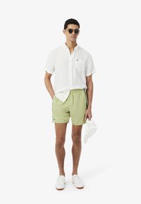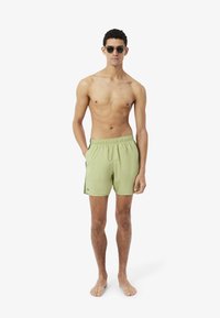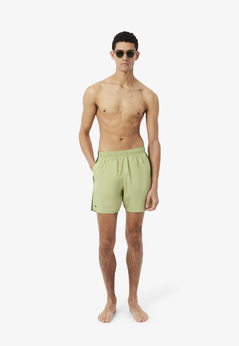 Homme torse nu portant un short de bain vert et des lunettes de soleil, debout pieds nus, les mains dans les poches, sur fond blanc.