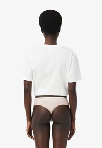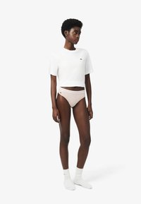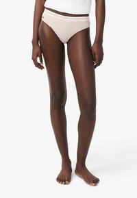Culotte bikini en coton rose clair avec une ceinture élastique rayée et une texture lisse, conçue pour le confort et l'ajustement.