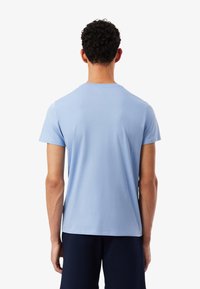 T-shirt en coton bleu clair avec un col rond, des manches courtes, et un petit logo vert sur la poitrine gauche. Porte avec un short foncé.