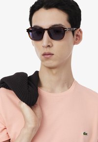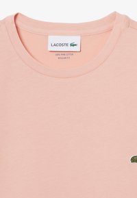 T-shirt en coton rose clair avec un col rond, arborant un petit logo vert Lacoste sur la poitrine, associé à un pantalon foncé et des lunettes de soleil.