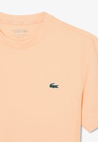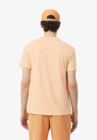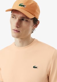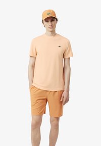 Homme portant un T-shirt pêche, un short assorti et une casquette, chacun avec un petit logo de crocodile vert sur la poitrine, la jambe et le devant de la casquette.