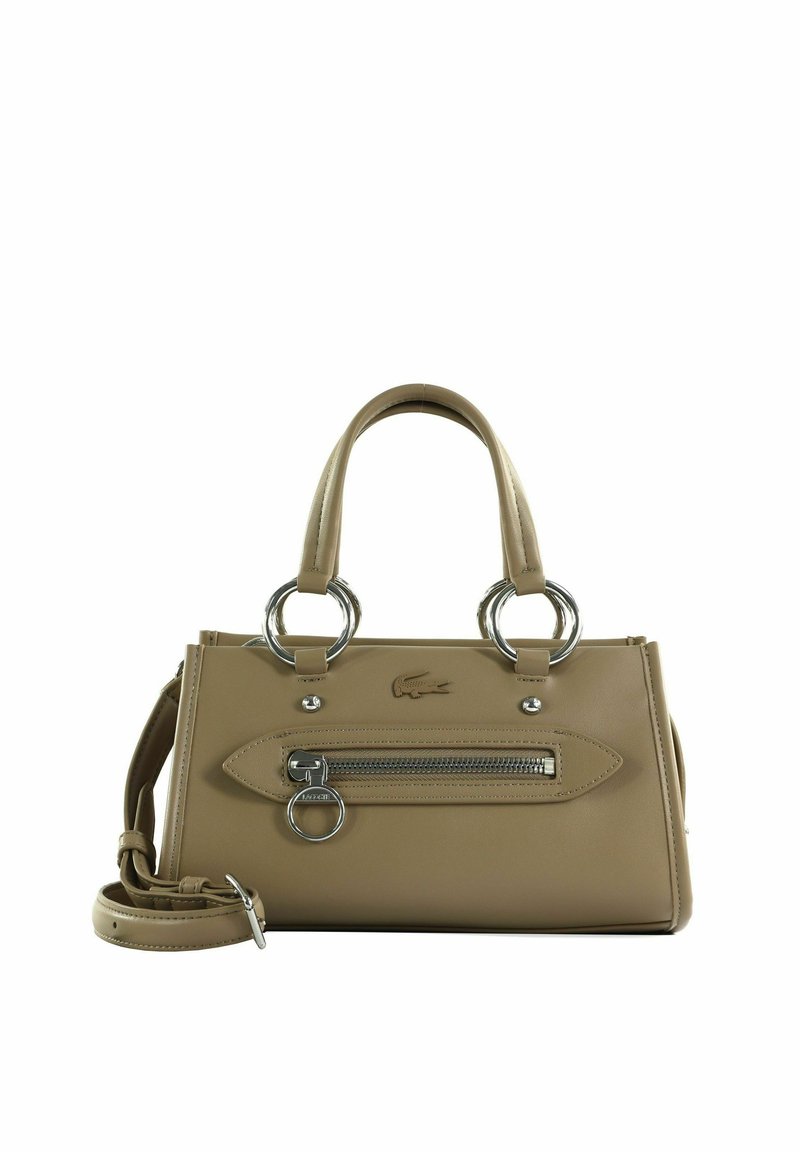 Sac à main en cuir beige avec double poignée, poche zippée avant, détails en anneaux argentés et bandoulière amovible.