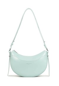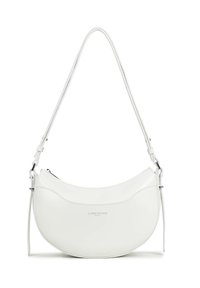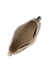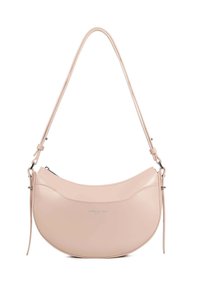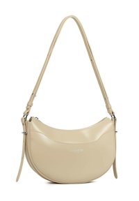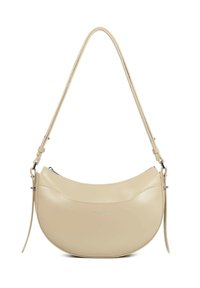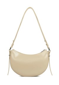 Sac à bandoulière en cuir beige en forme de croissant avec bandoulière ajustable et fermeture éclair argentée.