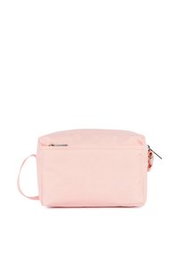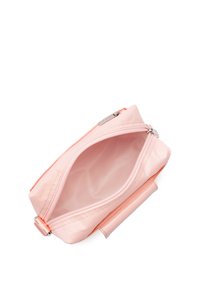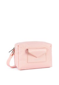Sac bandoulière rectangulaire rose pâle avec poche avant en forme d'enveloppe, fermeture éclair argentée et sangle réglable sur fond blanc.