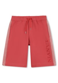 Shorts rouges jusqu'au genou avec une taille élastique, des bandes blanches sur les côtés, une poche arrière unique et une petite étiquette logo "Lanvin" sous la poche.