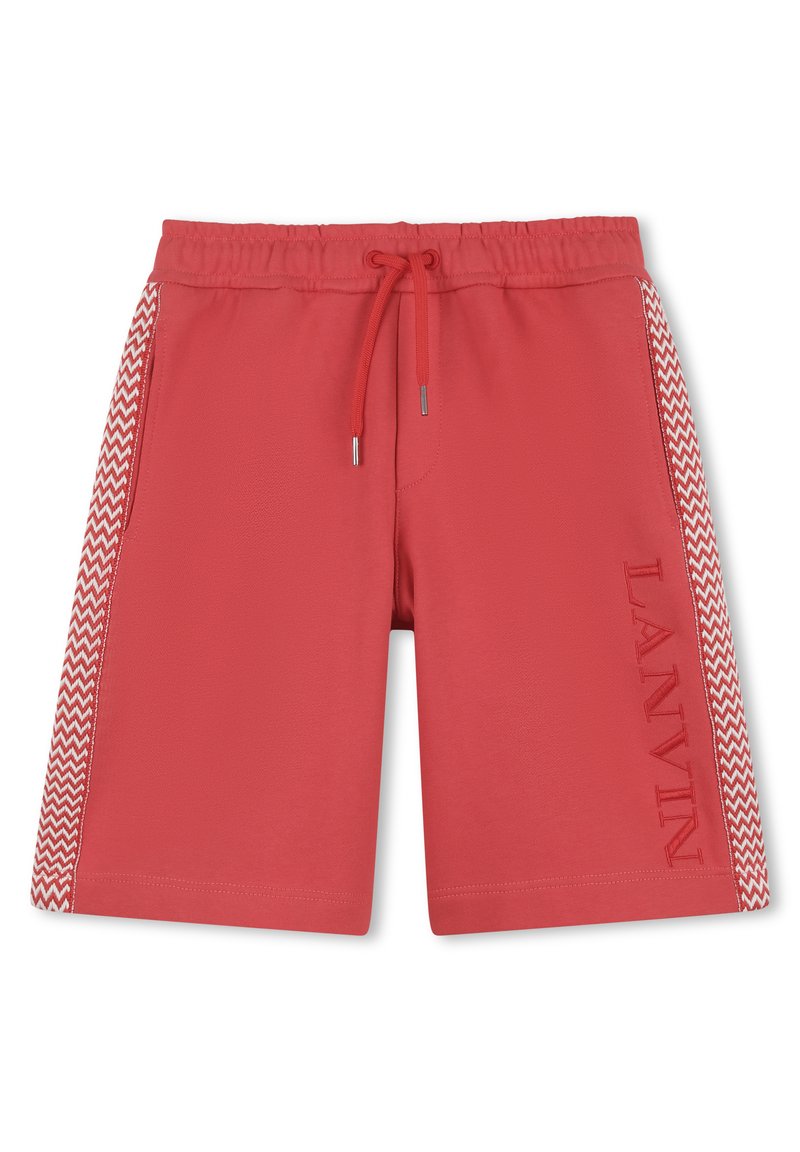 Shorts rouge à cordon avec des bandes latérales à motif zigzag et "LANVIN" brodé verticalement sur la jambe droite.