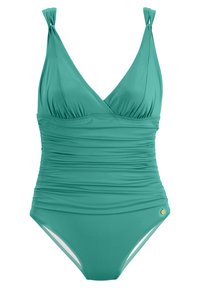 Maillot de bain une pièce violet avec un décolleté en V, un design froncé et des bretelles réglables. Détail accent en or notable en bas à droite. Tissu doux et extensible.