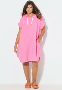 Femme aux longs cheveux bruns portant une robe rose ample à capuche avec poches et des sandales slides orange, debout sur un fond blanc.