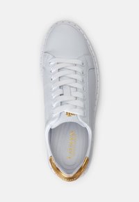Baskets basses blanches avec languette de talon dorée, design à lacets, et semelle blanche épaisse, présentées de profil sur fond uni.