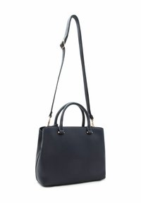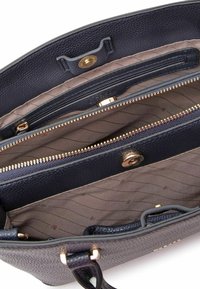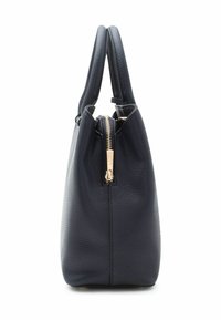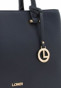 Sac à main en cuir noir texturé avec deux poignées, logo doré "L.CREDI" et un pendentif rond en or suspendu à une poignée.