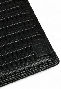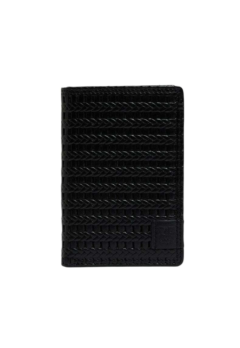 Portefeuille noir en cuir texturé, présentant un motif tressé et un petit écusson logo dans le coin inférieur droit. Forme rectangulaire compacte.