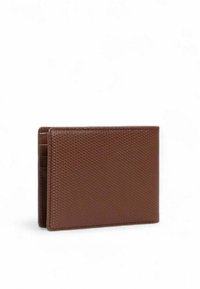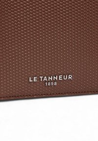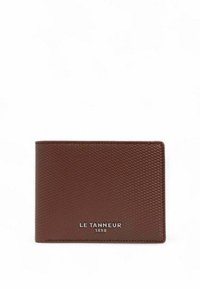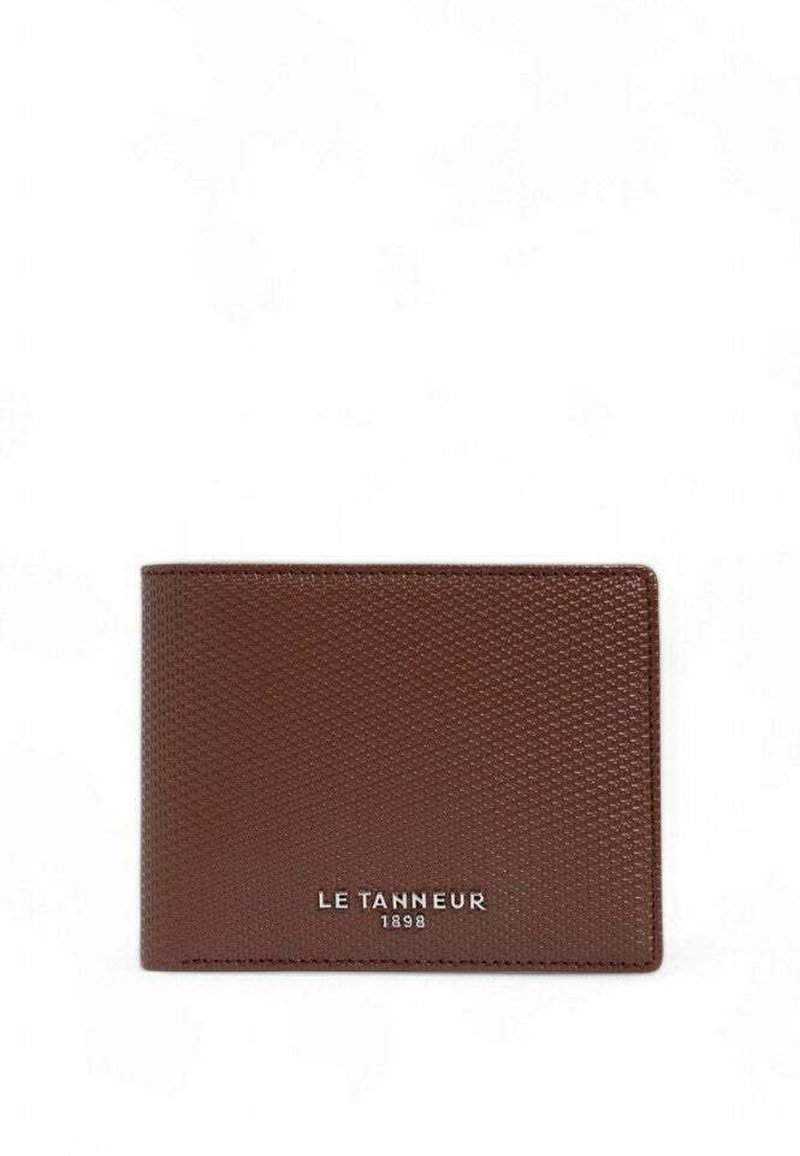 Portefeuille en cuir marron avec une finition texturée, arborant un logo argenté "LE TANNEUR 1898" en bas. Design pliable en deux, forme compacte.