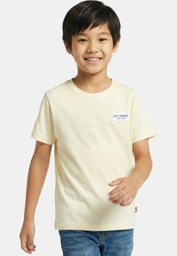 Garçon souriant se retournant, portant un t-shirt beige clair Lee Cooper avec un jean en denim, montrant le logo de la marque au dos du t-shirt.